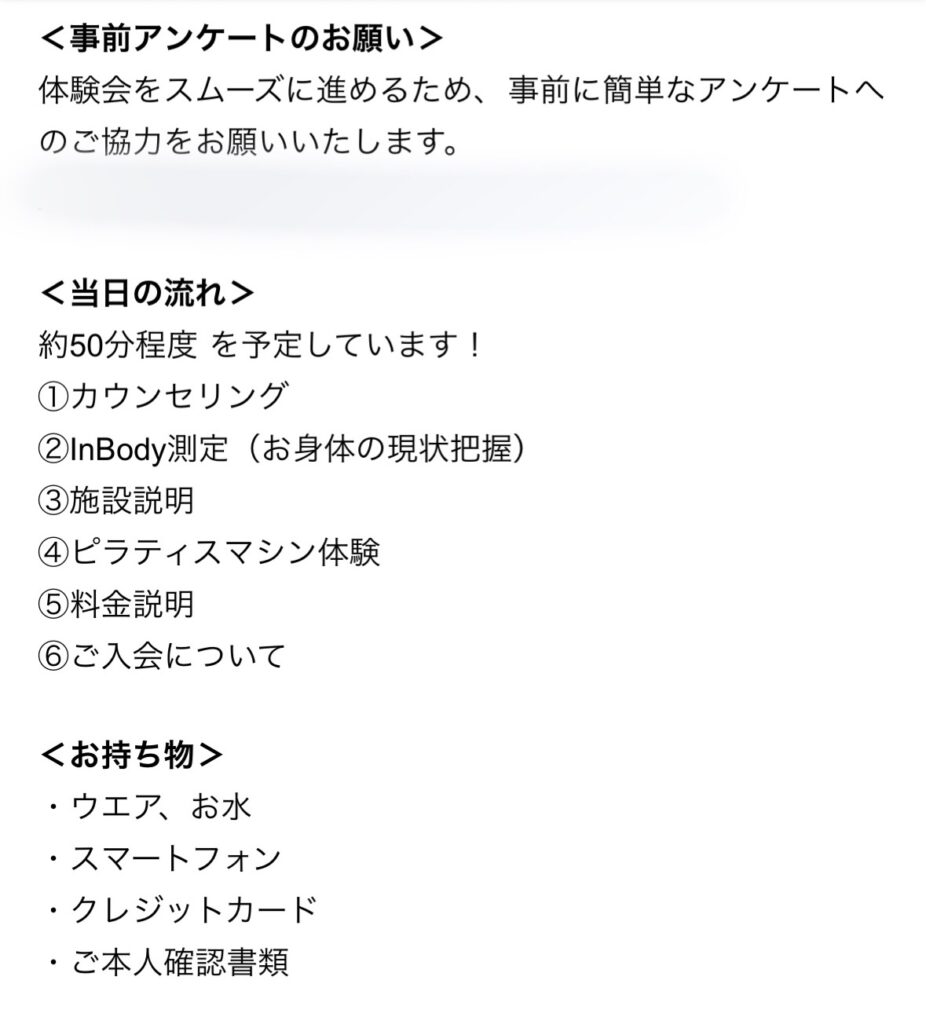メールには当日の流れや持ち物が書かれていて、安心です。